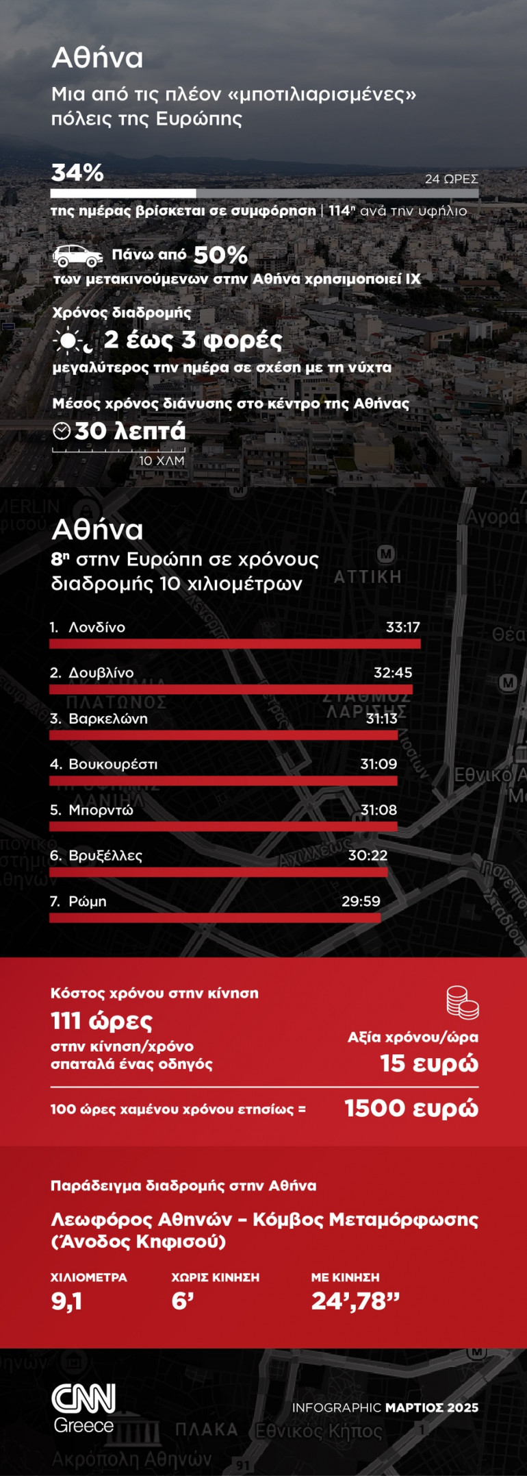 Όσοι και όσες οδηγούν στην ευρύτερη περιοχή της Αθήνας περνούν το ένα τρίτο του οδηγικού τους χρόνου σε κυκλοφοριακή συμφόρηση. Η πρόσφατη μελέτη του εργαστηρίου συγκοινωνιακής τεχνικής του Εθνικού Μετσόβιου Πολυτεχνείου αποκαλύπτει ότι η Ελλάδα είναι μια από τις πιο «μποτιλιαρισμένες» πρωτεύουσες τις Ευρώπης, όπου ο μέσος χρόνος για να διανύσει κανείς 10 χιλιόμετρα, είναι 30 λεπτά.