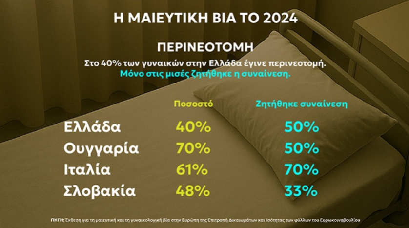 Λεκτική, ψυχολογική αλλά και σωματική βία καταγράφεται σε μεγάλο ποσοστό εντός των μαιευτηρίων -είτε πρόκειται για φυσιολογικό τοκετό είτε για καισαρική τομή. Και εκεί, η Ελλάδα φαίνεται να κατέχει αρνητική πρωτιά, όπως αναφέρει η ίδια: «Η χώρα μας παρουσιάζει από τα υψηλότερα ποσοστά καισαρικών παγκοσμίως».