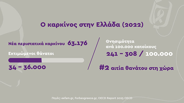 Πάνω από μισό εκατομμύριο άτομα ζουν με καρκίνο στην Ελλάδα, ενώ οι νέες διαγνώσεις αυξάνονται κατά περίπου 60.000 το χρόνο. Το ποσοστό επίπτωσης του καρκίνου, σταθμισμένο ως προς την ηλικία, στην Ελλάδα είναι ελαφρώς χαμηλότερο από τον μέσο όρο της ΕΕ (2022), ενώ το ποσοστό επιπολασμού είναι ελαφρώς υψηλότερο (2020), γεγονός που υπογραμμίζει τη σημασία της εστίασης στη βελτίωση της ποιότητας ζωής των ασθενών με καρκίνο. Η επίπτωση του καρκίνου προβλέπεται να αυξηθεί κατά 12 % έως το 2040, κυρίως λόγω της γήρανσης του πληθυσμού.