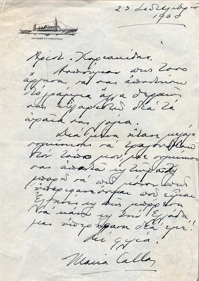 Επιστολή της Μαρία Κάλλας το 1960 προς στον Πρόεδρο του Ωδείου Αθηνών Αριστείδη Κυριακίδη μετά την παράσταση της Νόρμας του Μπελίνι στην Επίδαυρο. Ιδιαίτερη αξία έχουν τα λόγια με τα οποία κλείνει η επιστολή: «Υπερηφανεύομαι που είμαι Ελληνίς και που έκαμα την πατρίδα μου υπερήφανη δι' εμέ». Χαρακτηριστικό δε το επιστολόχαρτο στο οποίο γράφει η Κάλλας, το οποίο στο άνω μέρος του έχει το σκίτσο της θαλαμηγού Χριστίνα του Αριστοτέλη Ωνάση. (Ιστορικό Αρχείο Ωδείου Αθηνών).