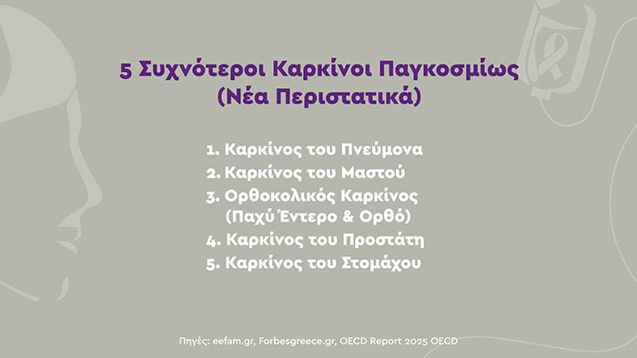 Πάνω από μισό εκατομμύριο άτομα ζουν με καρκίνο στην Ελλάδα, ενώ οι νέες διαγνώσεις αυξάνονται κατά περίπου 60.000 το χρόνο. Το ποσοστό επίπτωσης του καρκίνου, σταθμισμένο ως προς την ηλικία, στην Ελλάδα είναι ελαφρώς χαμηλότερο από τον μέσο όρο της ΕΕ (2022), ενώ το ποσοστό επιπολασμού είναι ελαφρώς υψηλότερο (2020), γεγονός που υπογραμμίζει τη σημασία της εστίασης στη βελτίωση της ποιότητας ζωής των ασθενών με καρκίνο. Η επίπτωση του καρκίνου προβλέπεται να αυξηθεί κατά 12 % έως το 2040, κυρίως λόγω της γήρανσης του πληθυσμού.