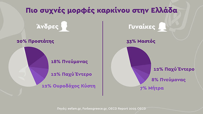 Η εικόνα είναι παρόμοια και στη χώρα μας. Σύμφωνα με τα στοιχεία του ΟΟΣΑ για την Ελλάδα, ο καρκίνος μαζί με τις καρδιοπάθειες είναι οι πρώτες αιτίες θανάτου. Οι περισσότεροι θάνατοι από καρκίνο, οφείλονται σε καρκίνο του πνεύμονα.